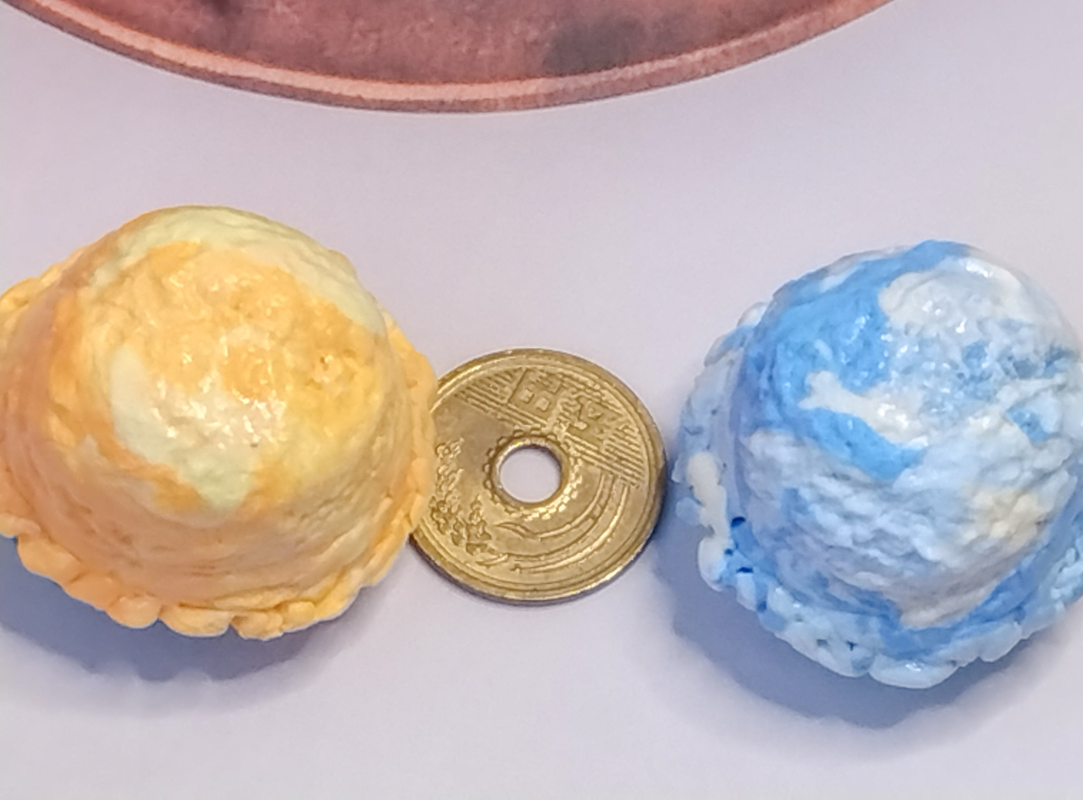 オレンジとブルーのアイスクリームは、一つ一つ丁寧に仕上げられており、ハンドメイドならではの温かみを感じられます。あなたのお気に入りの場所に飾って、ぜひ楽しんでいただきたいです。